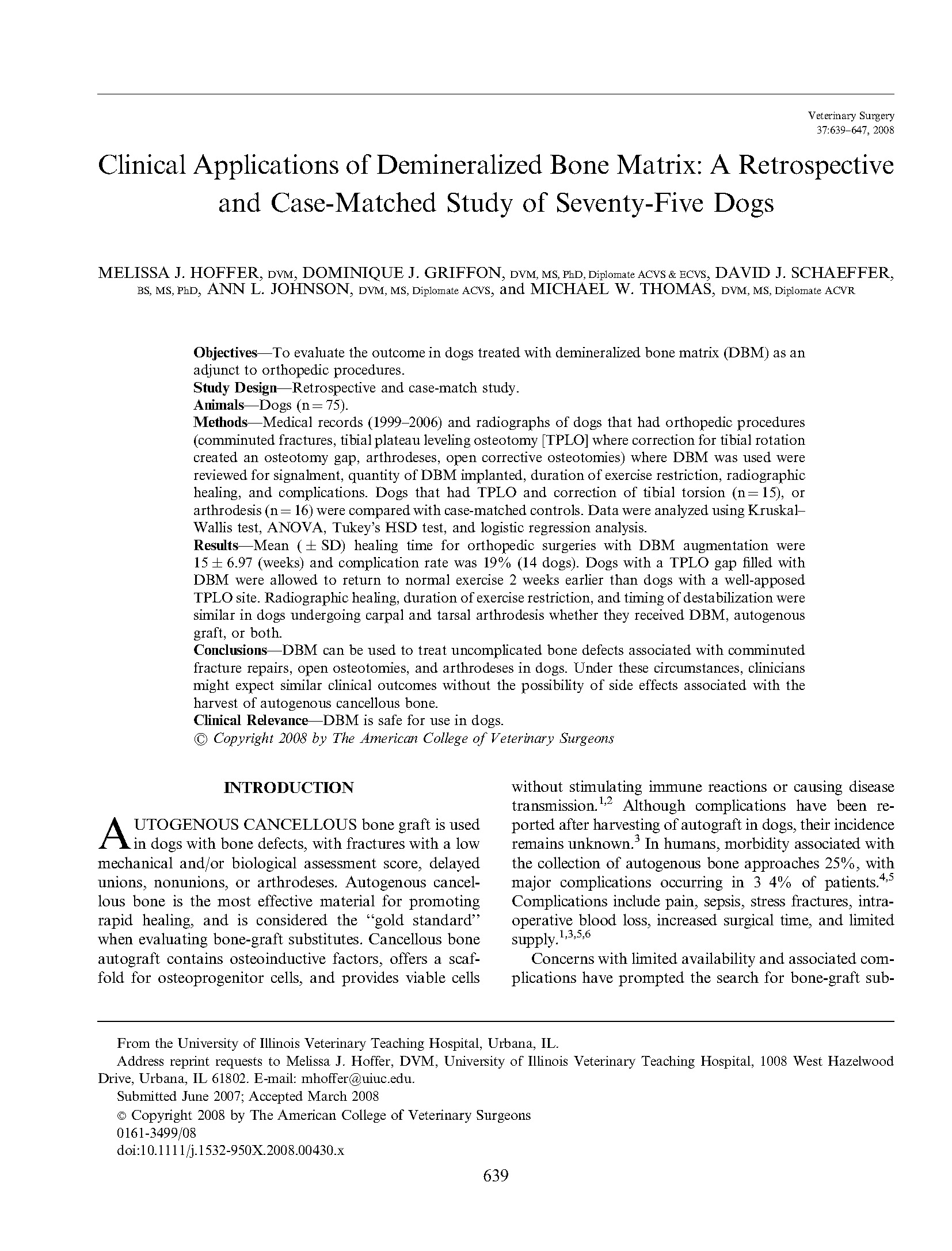 demineralized bone matrix: A retrospective and case-matched study of 75 dogs. Vet Surg. 37:639-647, 2008.