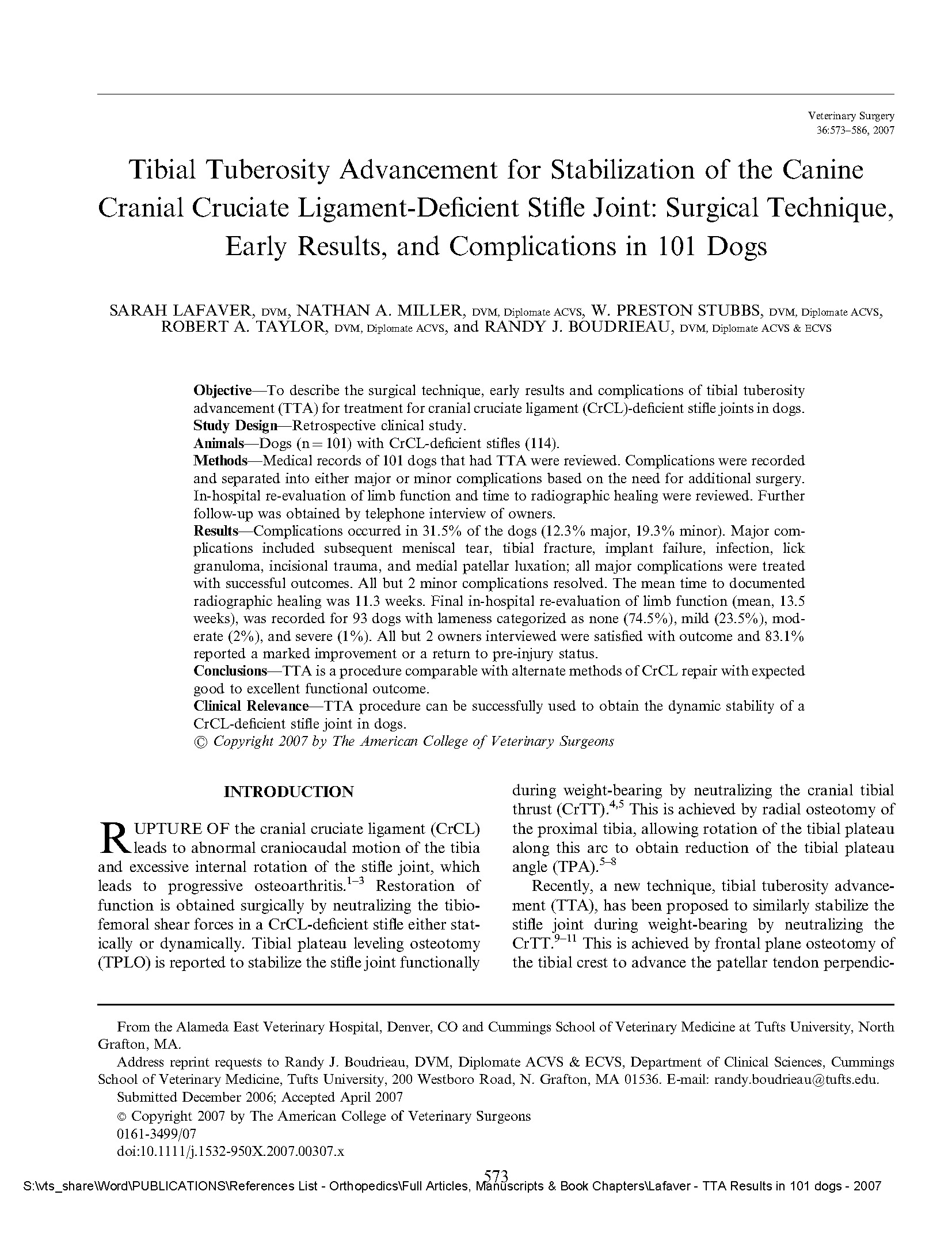 Veterinary Surgery. 36:573-586, 2007. |